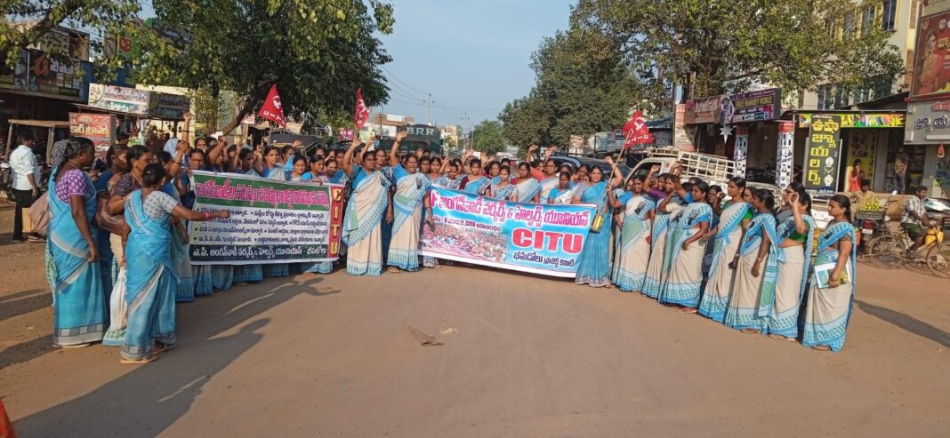 The strike of the Anganwadi workers entered the second day today and the workers continued agitations across the district on Wednesday. A large number of Agitating Anganwadi workers staged a dharna at Bhimadole on Wednesday. Holding flexi banners, they raised slogans demanding the government to concede their legitimate demands. The Anganwadi workers and helpers are demanding the government to hike their salary to Rs 26,000, Rs 5 lakh retirement benefit, half of the salary should be paid as pension, gratuity should be paid as per the Supreme Court guidelines, mini-centres should be converted as main centres, budget should be hiked to the ICDS and the FRS app should be revoked.