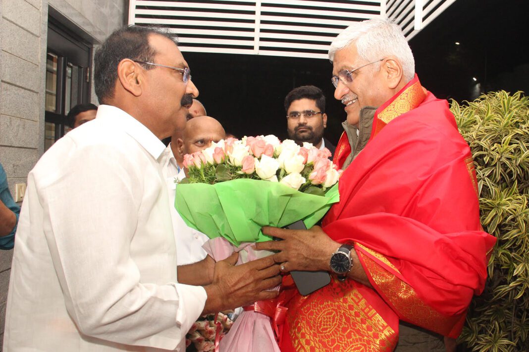 On his arrival at  GMR Rest House, he was accorded a warm reception by TTD Chairman B Karunakara Reddy and TTD EO AV Dharma Reddy. The Union Minister will offer prayers to the Lord on Sunday morning.